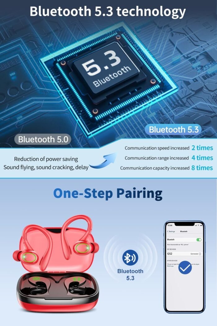 • 【Bluetooth 5.3 & Auto Pairing】The Bluetooth 5.3 chip ensure that the bluetooth headphones connects quickly and stably within 15 meters, pictures and wireless earphones’ sound are synchronized to take you better using experience. After pairing the devices for the first time, the headphones will automatically connect when you take them out of the charging case.